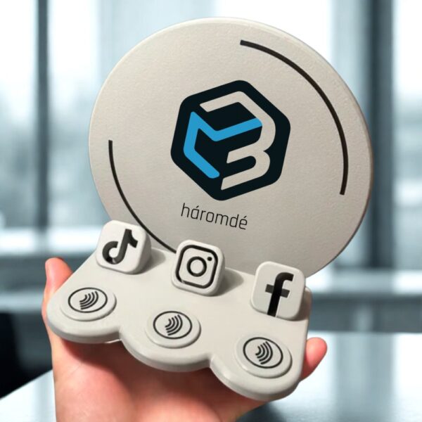 Egyedi céges NFC stand logóval és közösségi ikonokkal – modern, 3D-nyomtatott megoldás, amivel ügyfeleid egy érintéssel elérik vállalkozásod online felületeit. Stílusos, tartós és teljesen személyre szabható.